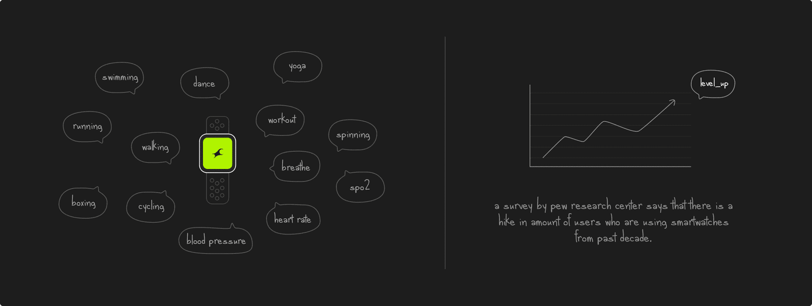 According to Pew Research Center survey, the graph of people who adapted smartwatch got a drastic spike over the decade. Most of them use their smartwatches to track their balance between the world and their physical & mental wellness.